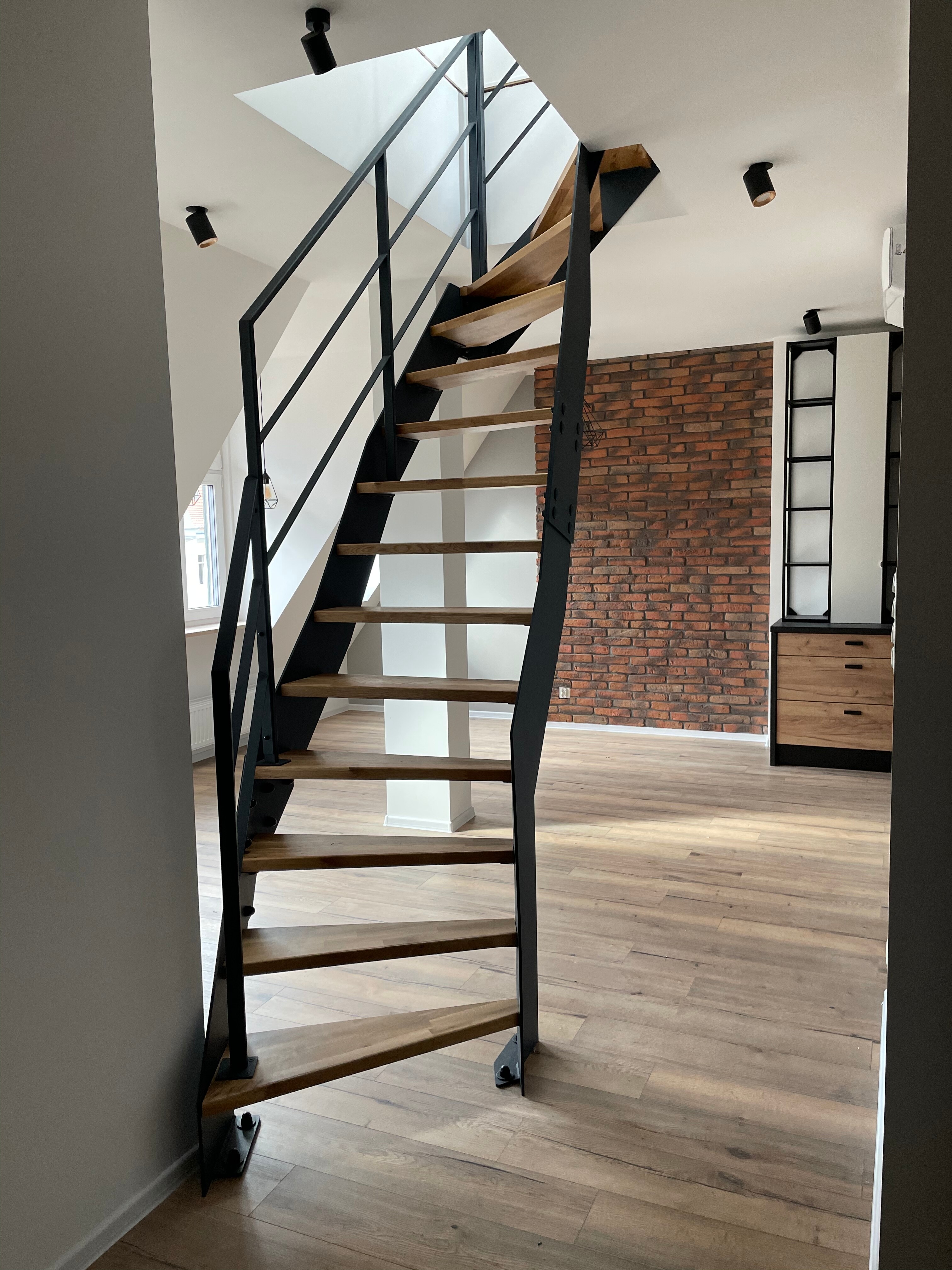 Schody policzkowe, składają się z dwóch bocznych elementów konstrukcyjnych z blachy wycinanej metodą laserową, pomiędzy nimi mocowane są stopnie.