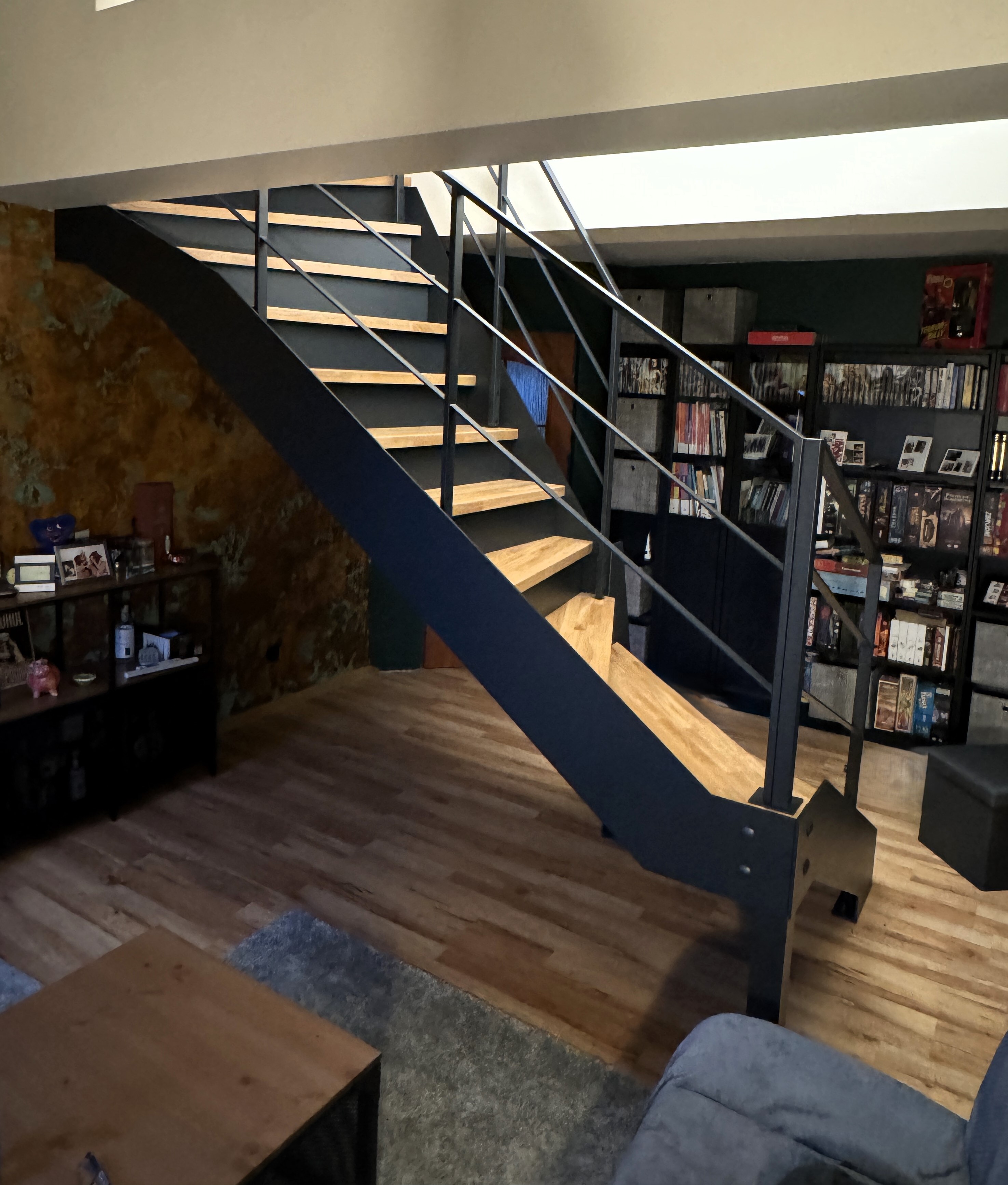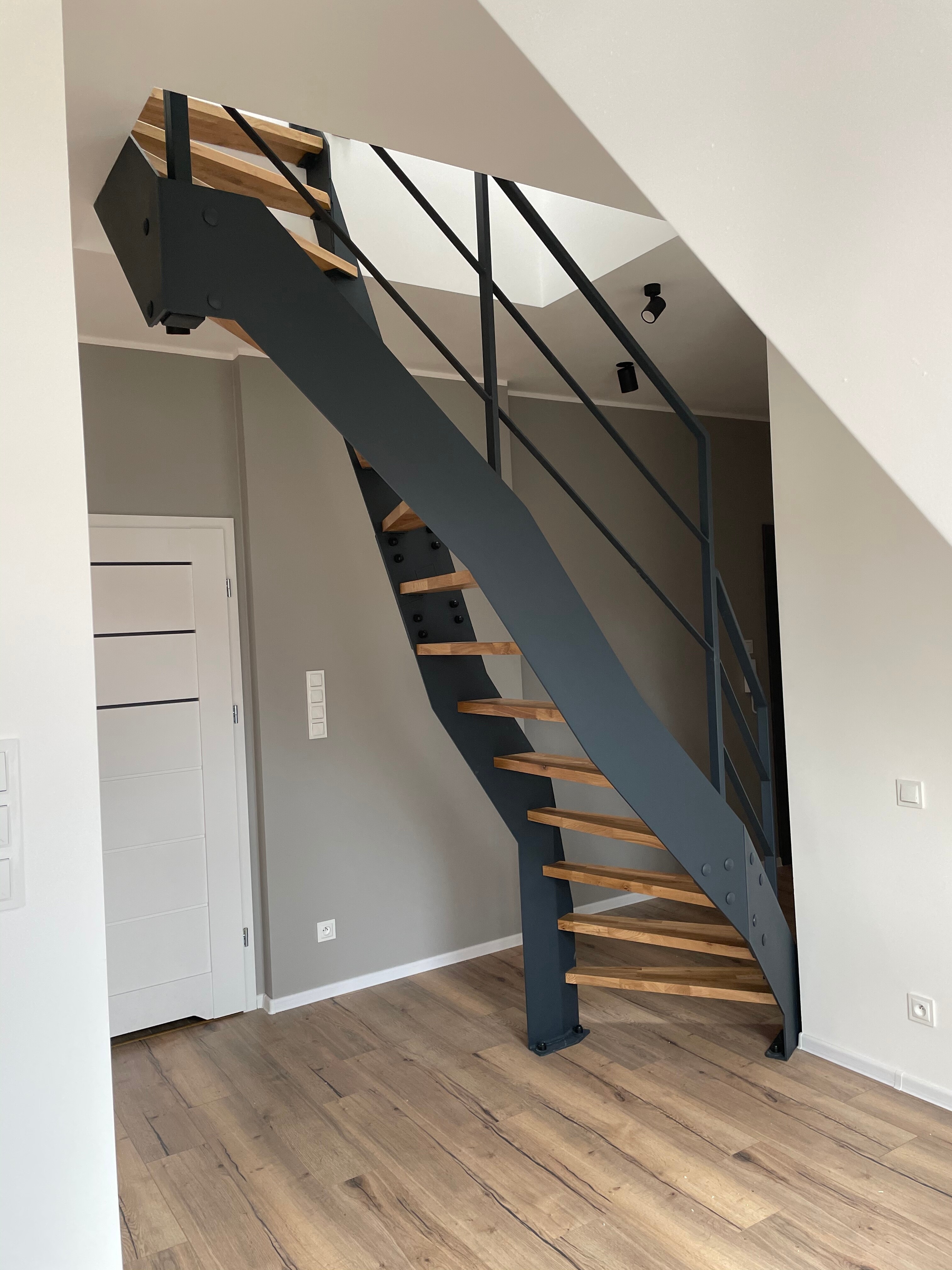 Schody policzkowe, składają się z dwóch bocznych elementów konstrukcyjnych z blachy wycinanej metodą laserową, pomiędzy nimi mocowane są stopnie.